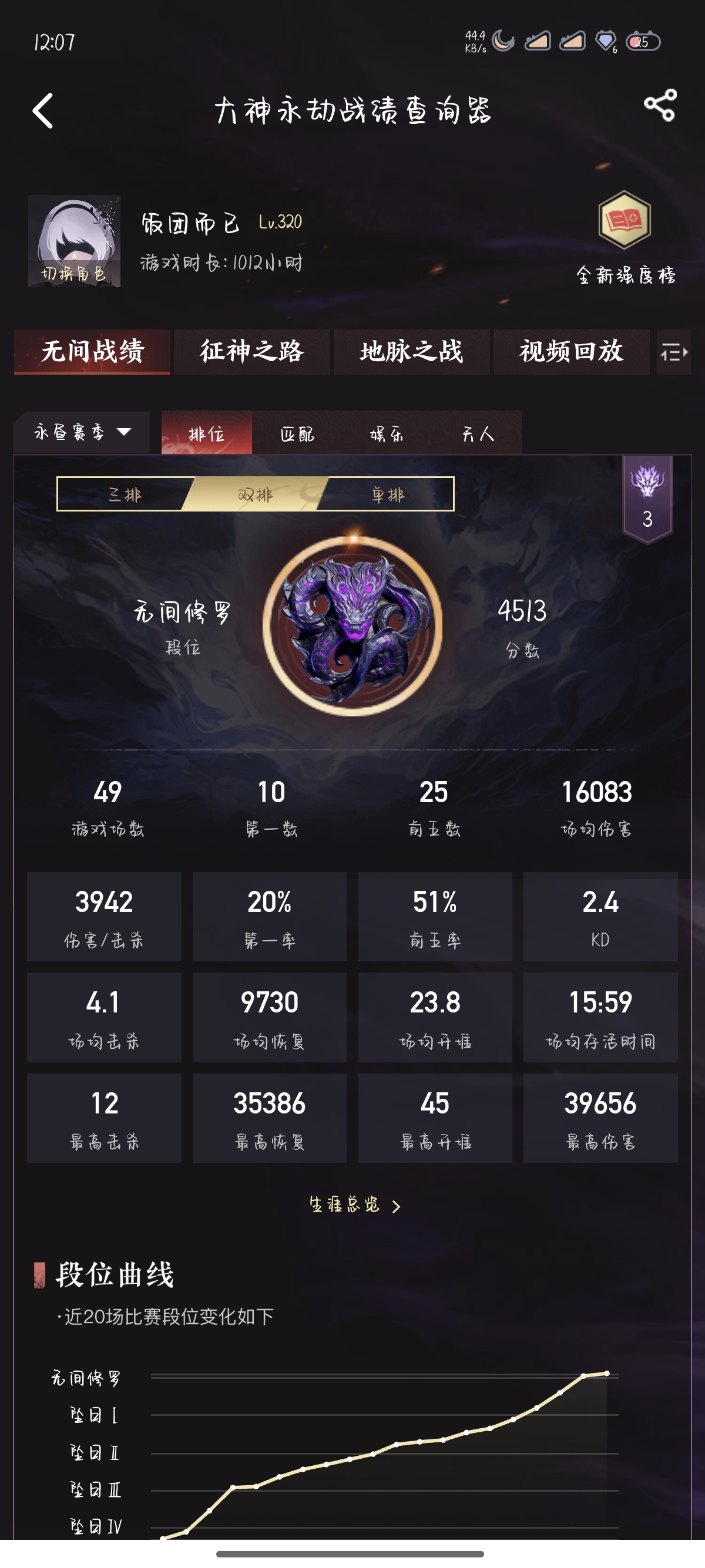 🍧【永劫无间】 历史最高:单排:黄金 双排:无双修罗 三排:无间修罗 当前段位:单排:铂金 双排:蚀月 三排:蚀月 单排场伤1.3w双排场伤:1w 三排场伤:8000 擅长英雄:季莹莹 殷紫萍 胡桃 沈妙 水娘 魏青 游戏时长:3500 h 内测就开始的老玩家,有小号,意识思路清晰,可教学,给老板捡金甲金刀,话多热情,照顾老板游戏体验。